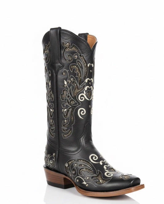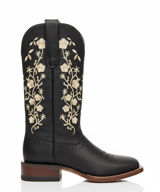 Women boots Black With Vintage Floral Embroidery